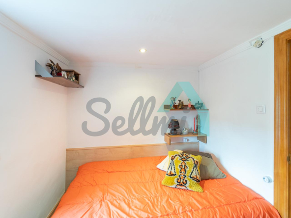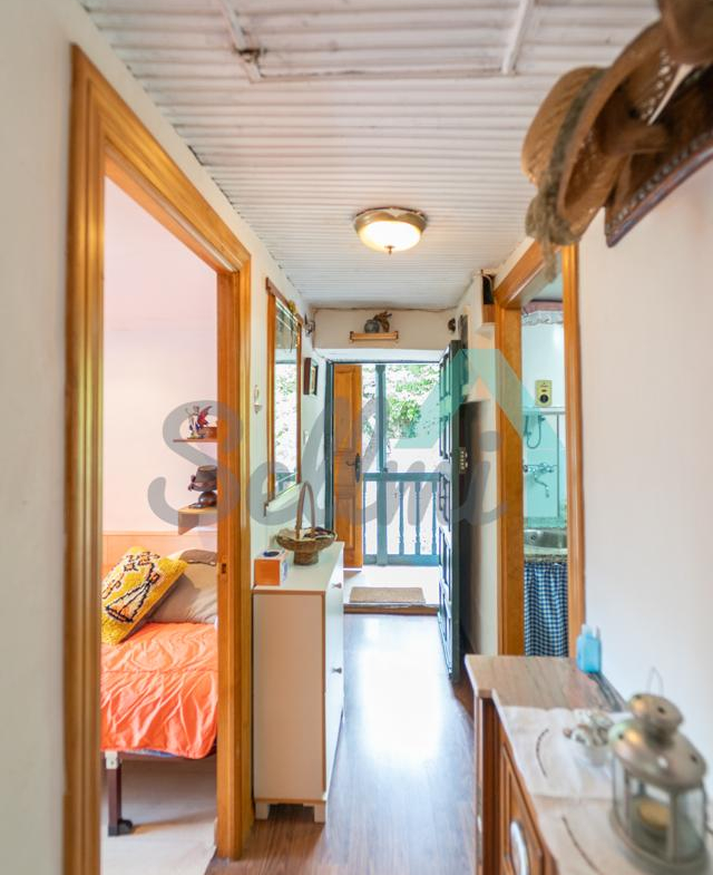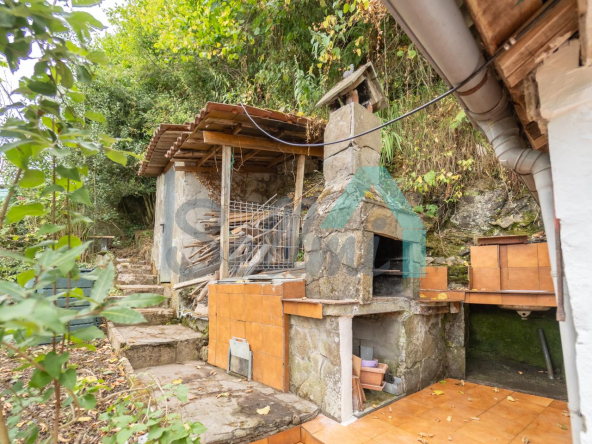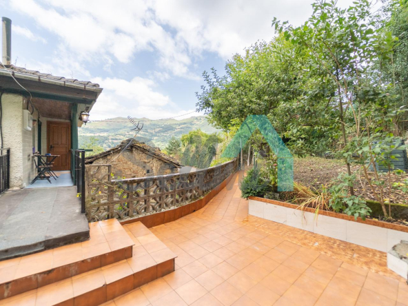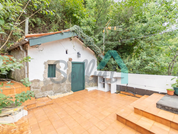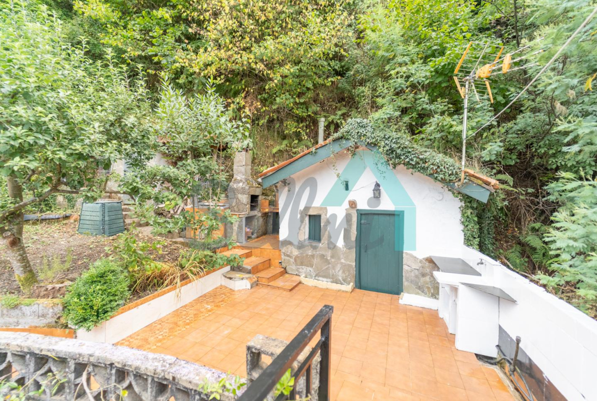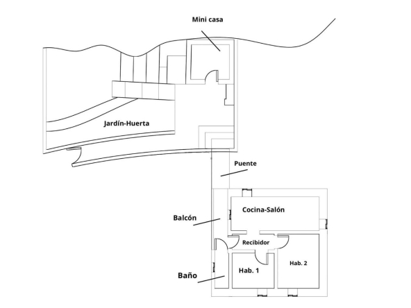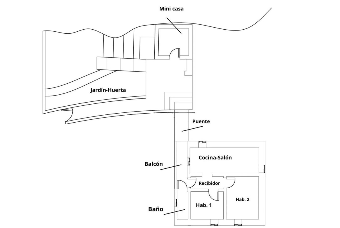 Este puente conecta con la entrada de la parcela, en la que cuenta con un terreno de 37,5 m2 que puede ser utilizado como jardín o huerto. Cuenta también con una casina pequeña con chimenea y que se puede transformar en habitación o salón. En el exterior cuenta con parrilla, leñero y cobertizo para almacenaje.