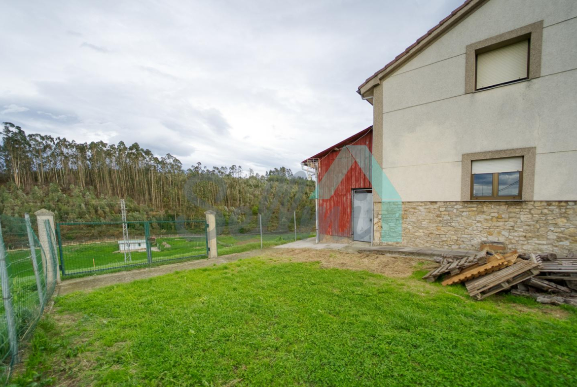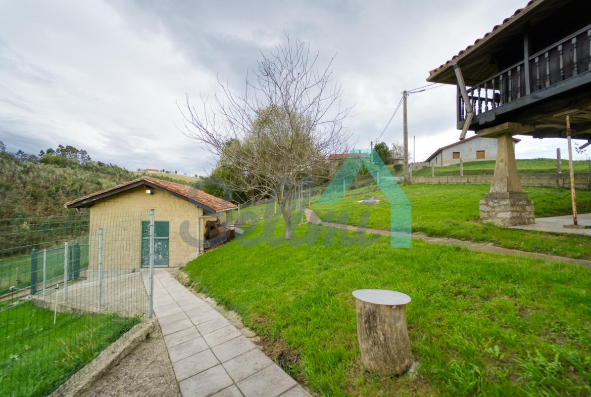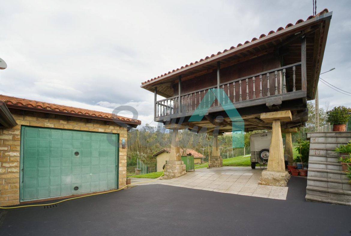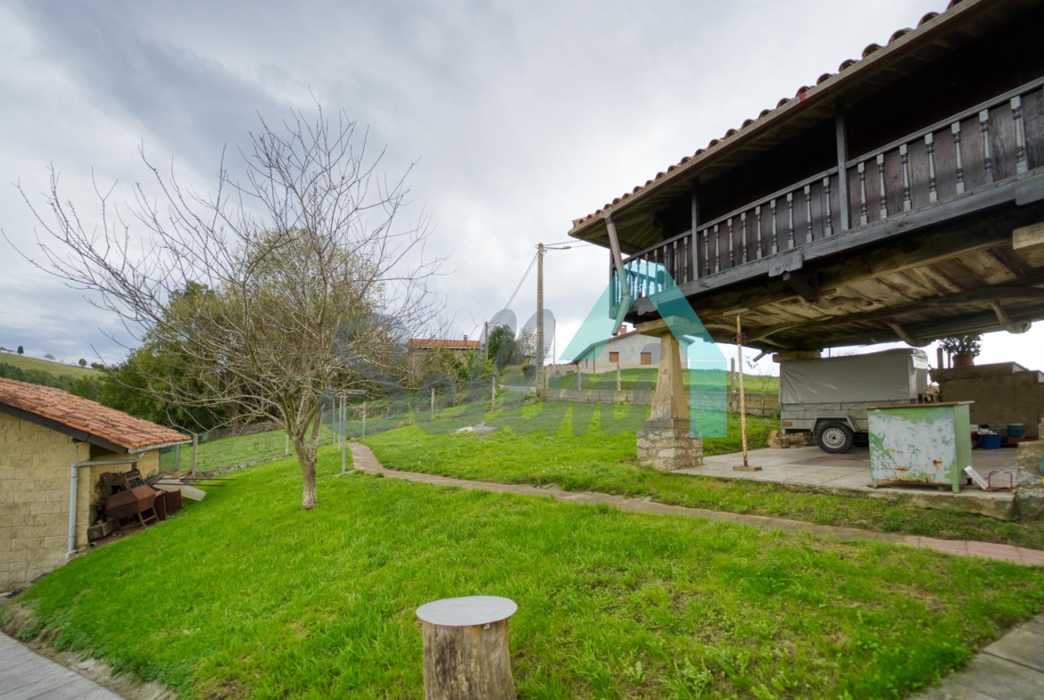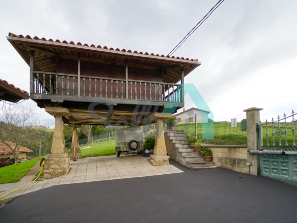 Se ubica sobre una parcela de 8.735 m2 en la que, además de la casa, cuenta con garaje, hórreo en muy buen estado, dos cuadras, gallinero, amplia zona ajardinada y aparcamiento exterior.
