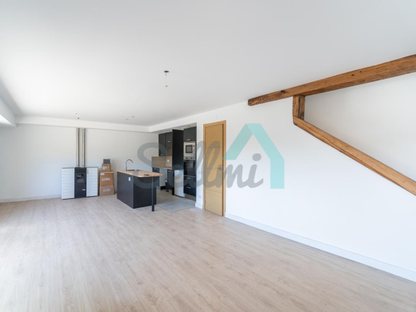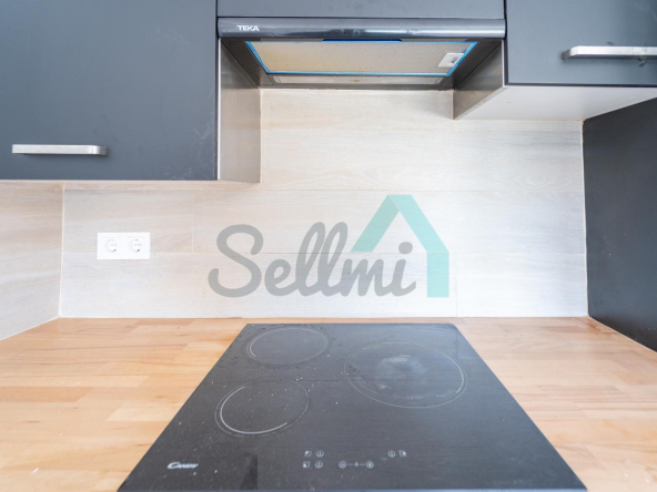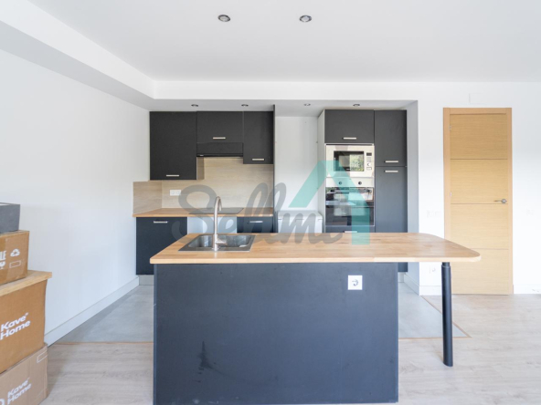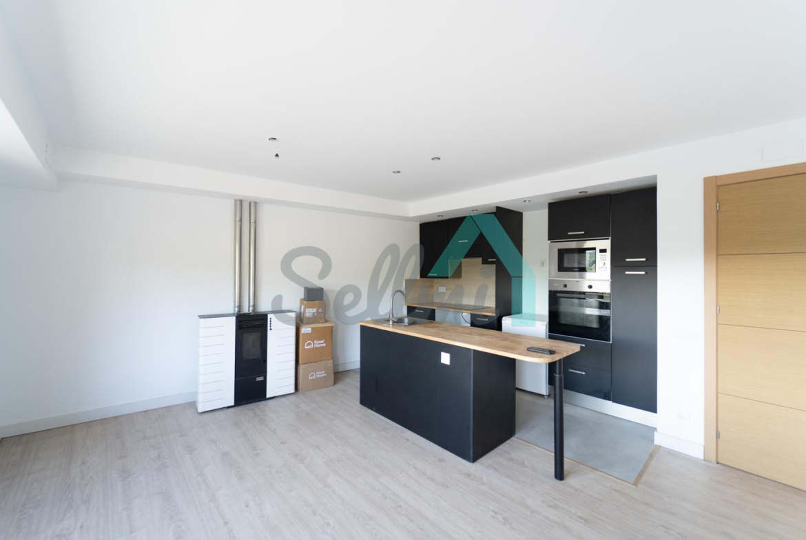Planta baja: salón comedor con cocina amueblada y equipada (vitro, campana, horno y microondas) y un aseo.
