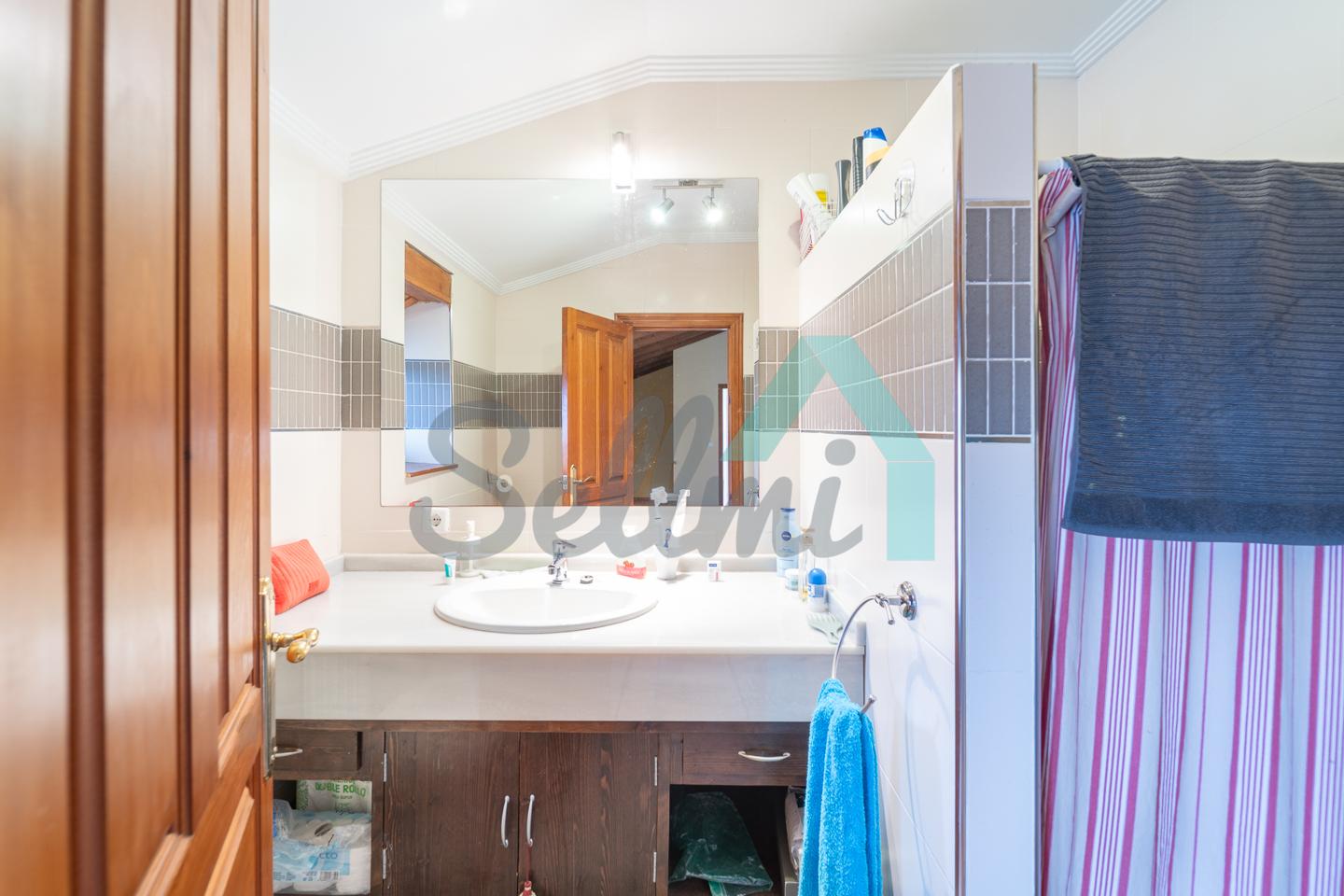 Planta alta con distribuidor, terraza, tres habitaciones y dos baños completos.