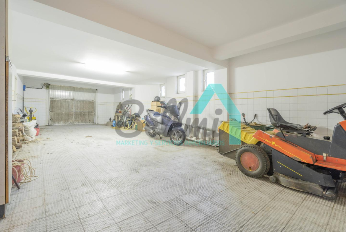 El sótano tiene un garaje con capacidad para cuatro coches, cuarto para la leña, cuarto de calderas, una habitación, un baño y una bodeguilla con chimenea y acceso al jardín.