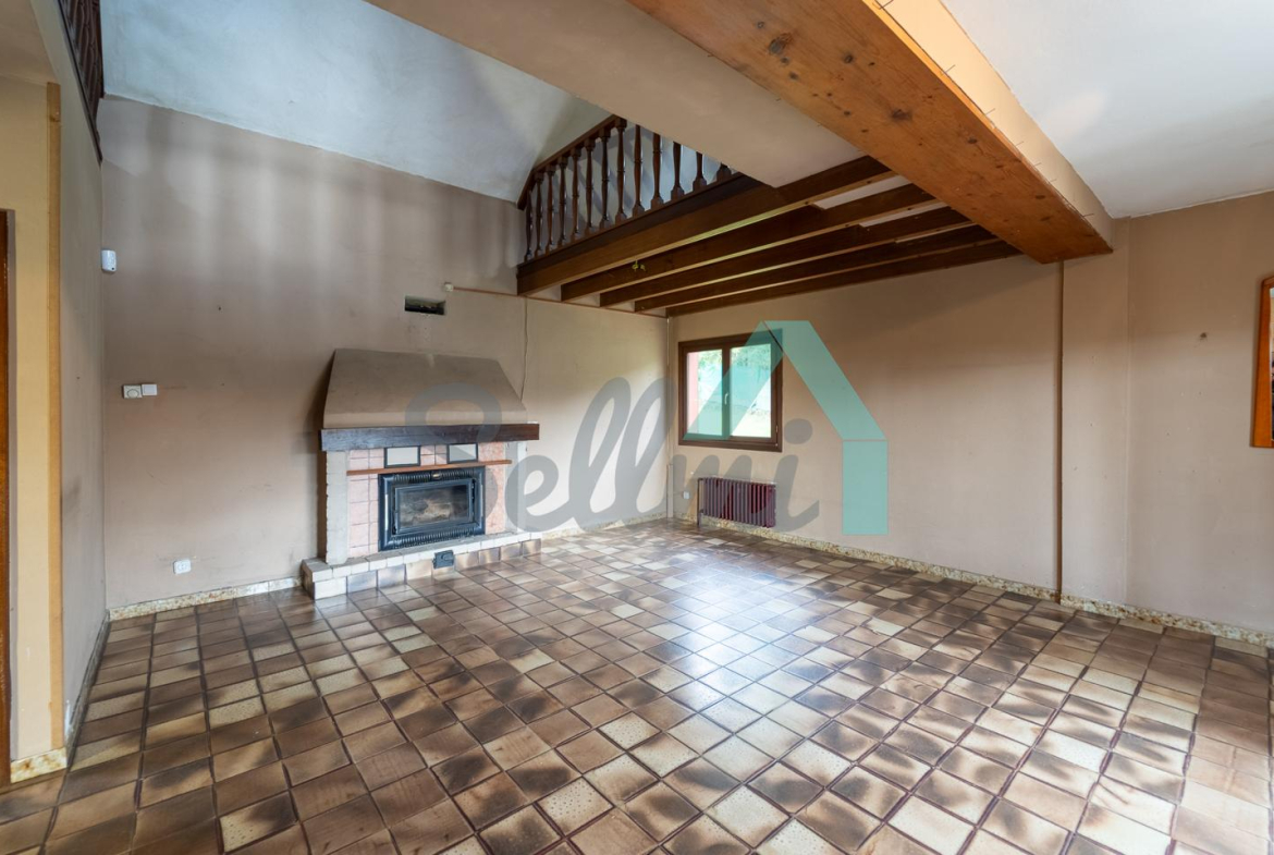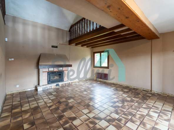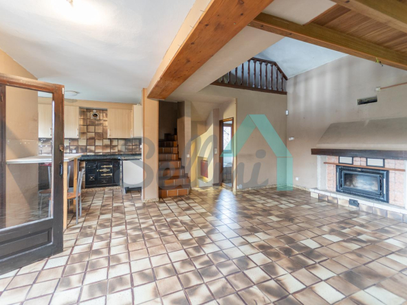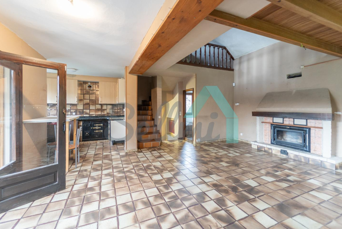Planta principal: salón comedor con chimenea, cocina amueblada y un baño completo.