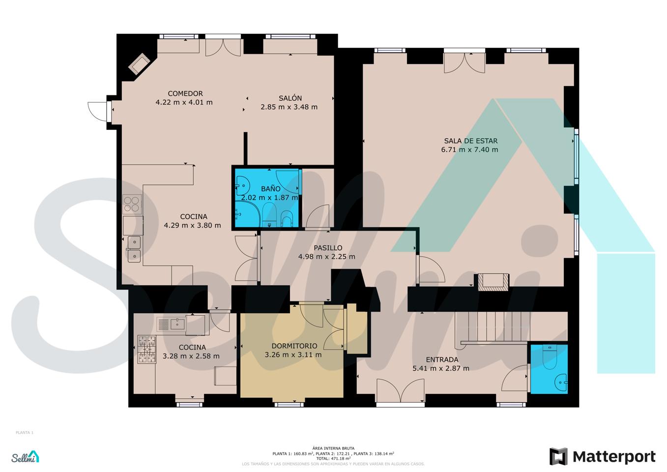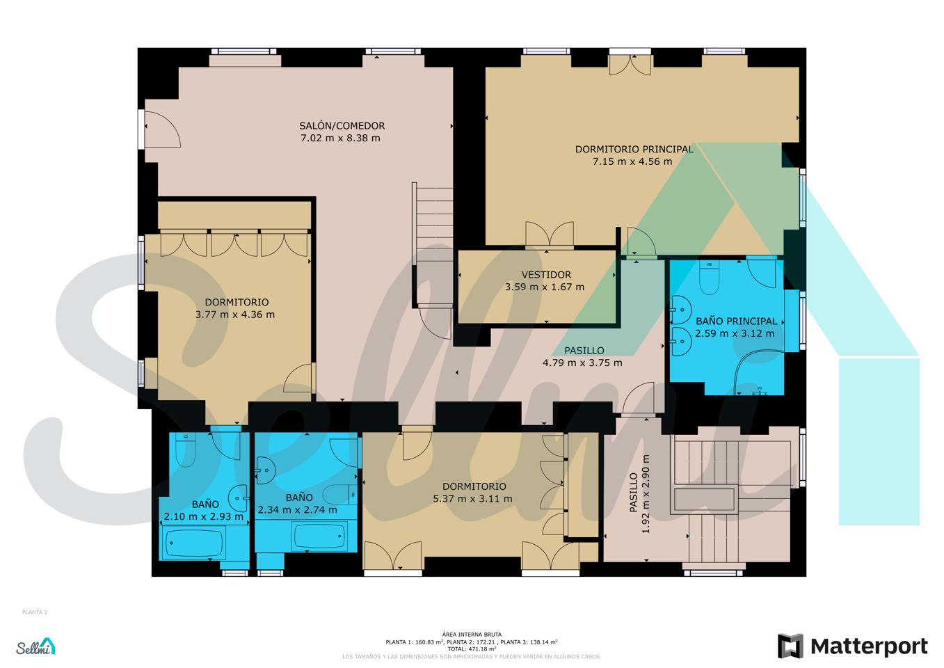 Planta primera: distribuidor, sala de estar y tres habitaciones, cada una de ellas con baño completo incorporado.