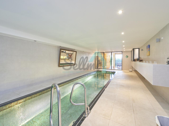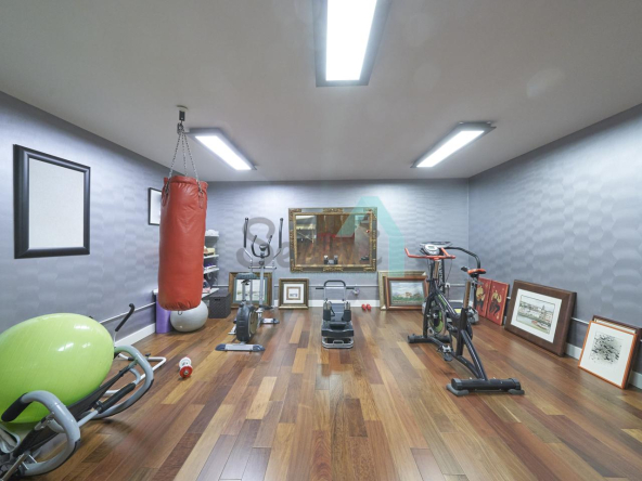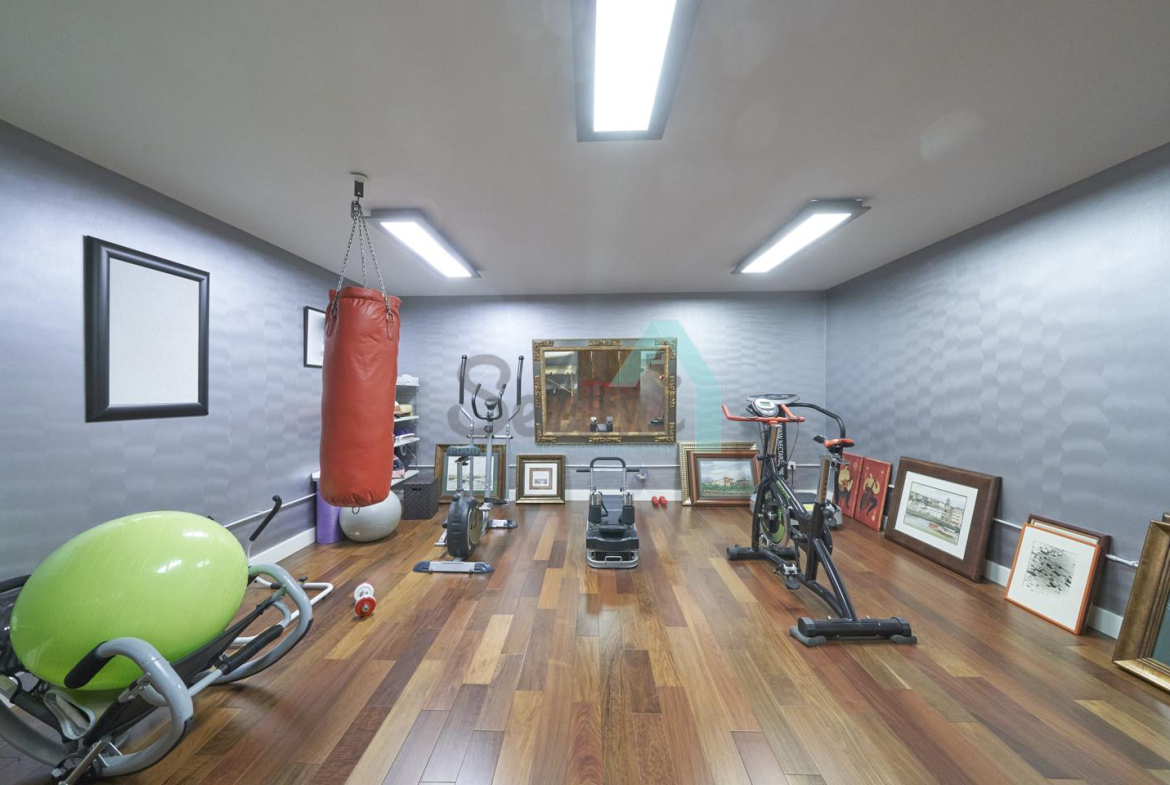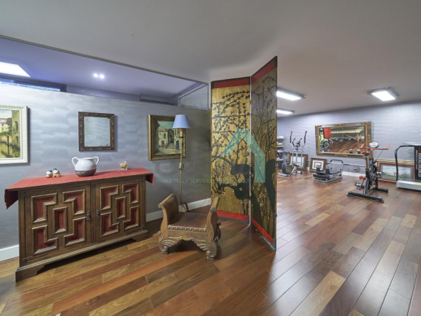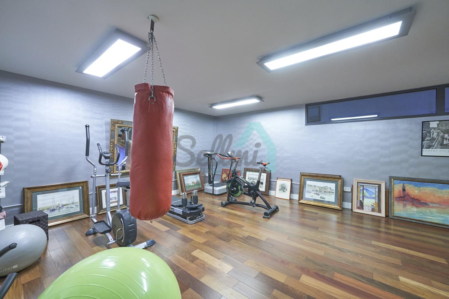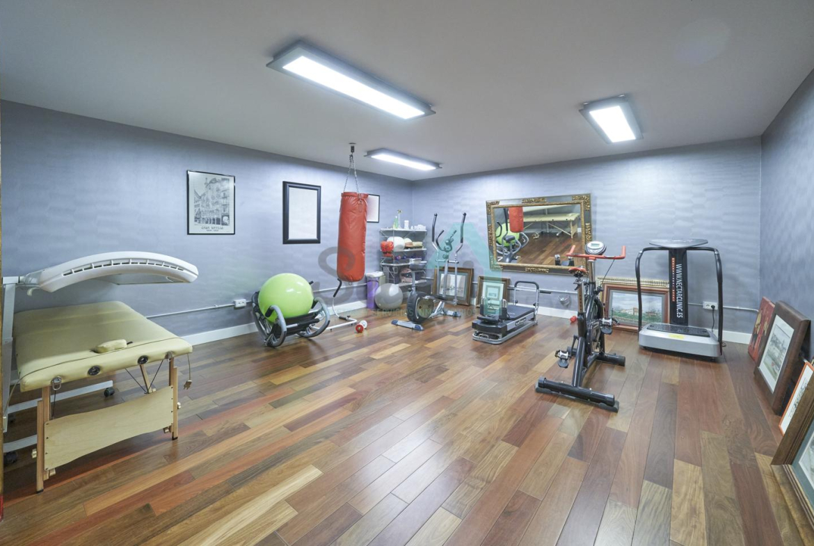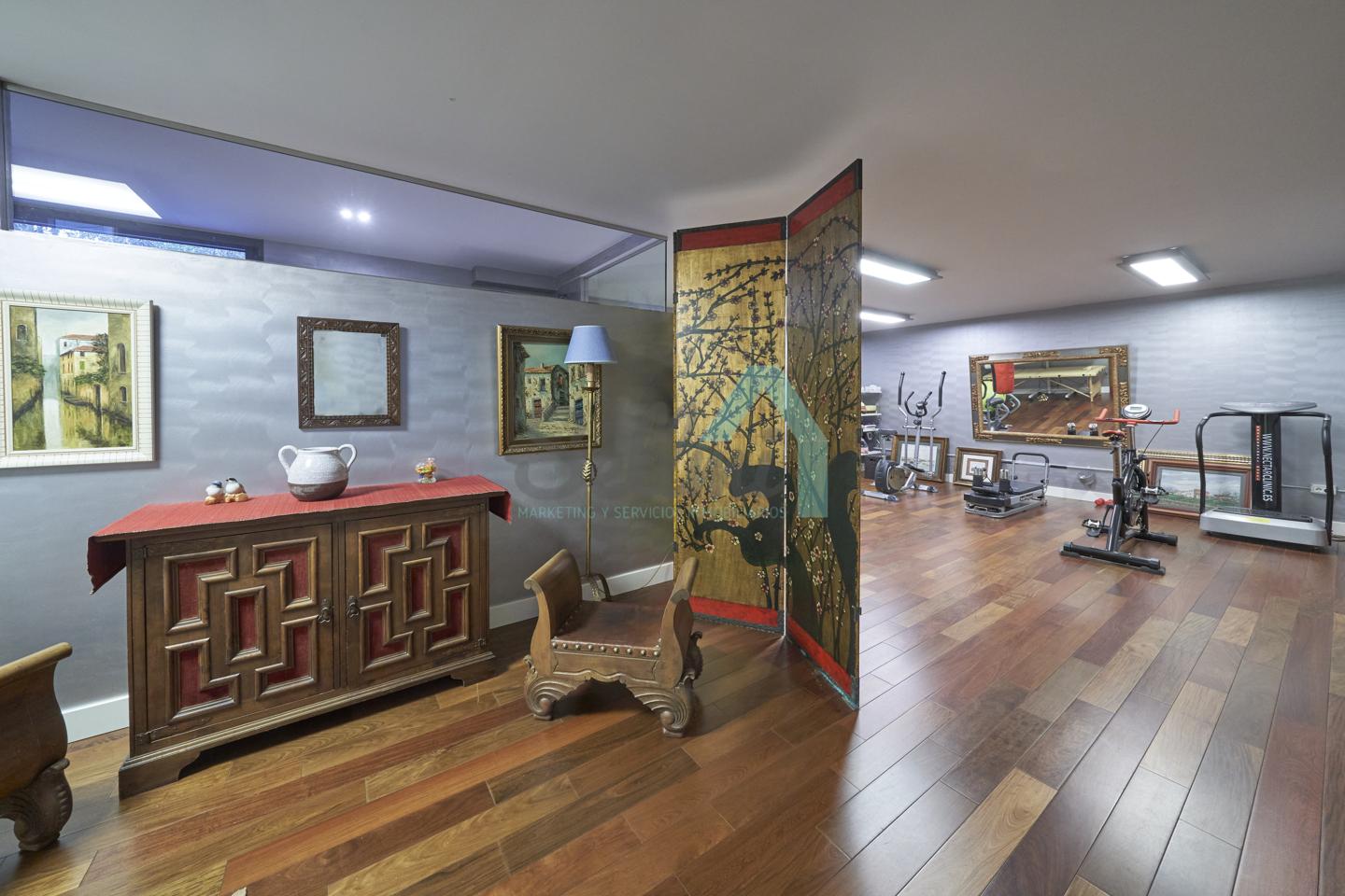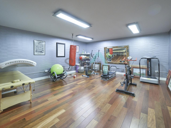 Planta baja: porche, hall de entrada, gimnasio, piscina climatizada de 12 metros de largo, garaje para dos coches, un baño-cuarto de plancha, sala de calderas.