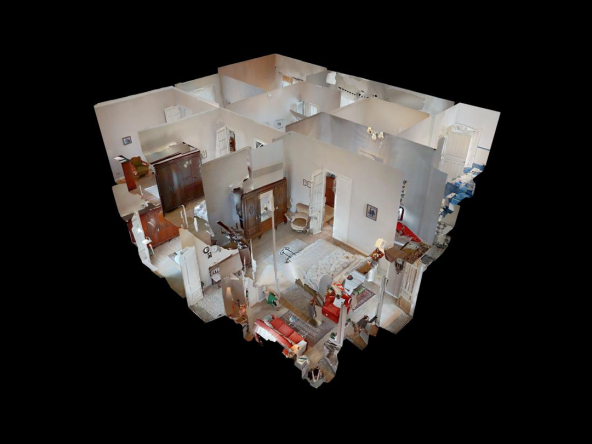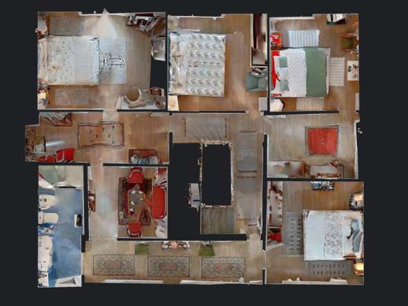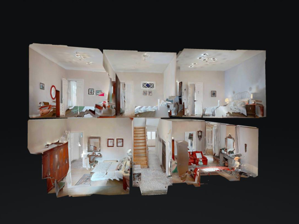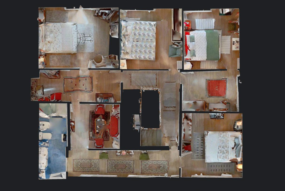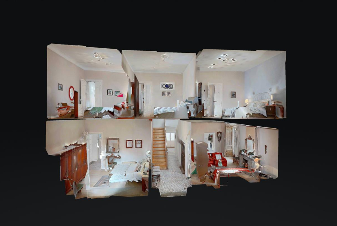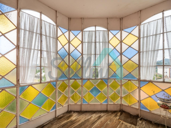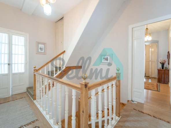 Planta alta: distribuidor, galería con cristalera de hierro, seis habitaciones y un baño completo.