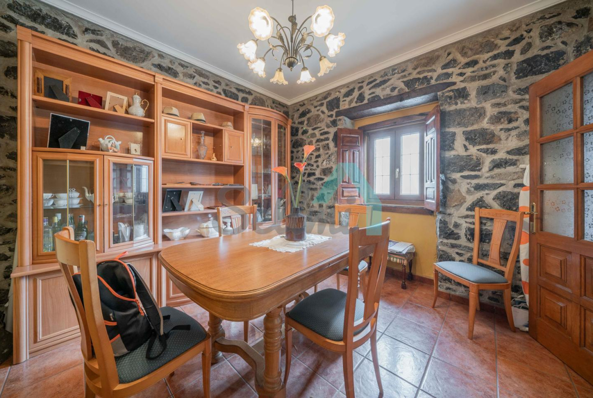 Planta principal (con muros de piedra): hall de entrada, salón, comedor, cocina amueblada y equipada (con vitrocerámica y cocina de leña), una habitación y un baño completo. Desde esta planta se accede a la terraza y a la parte trasera de la vivienda.