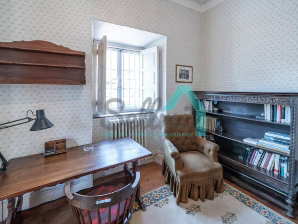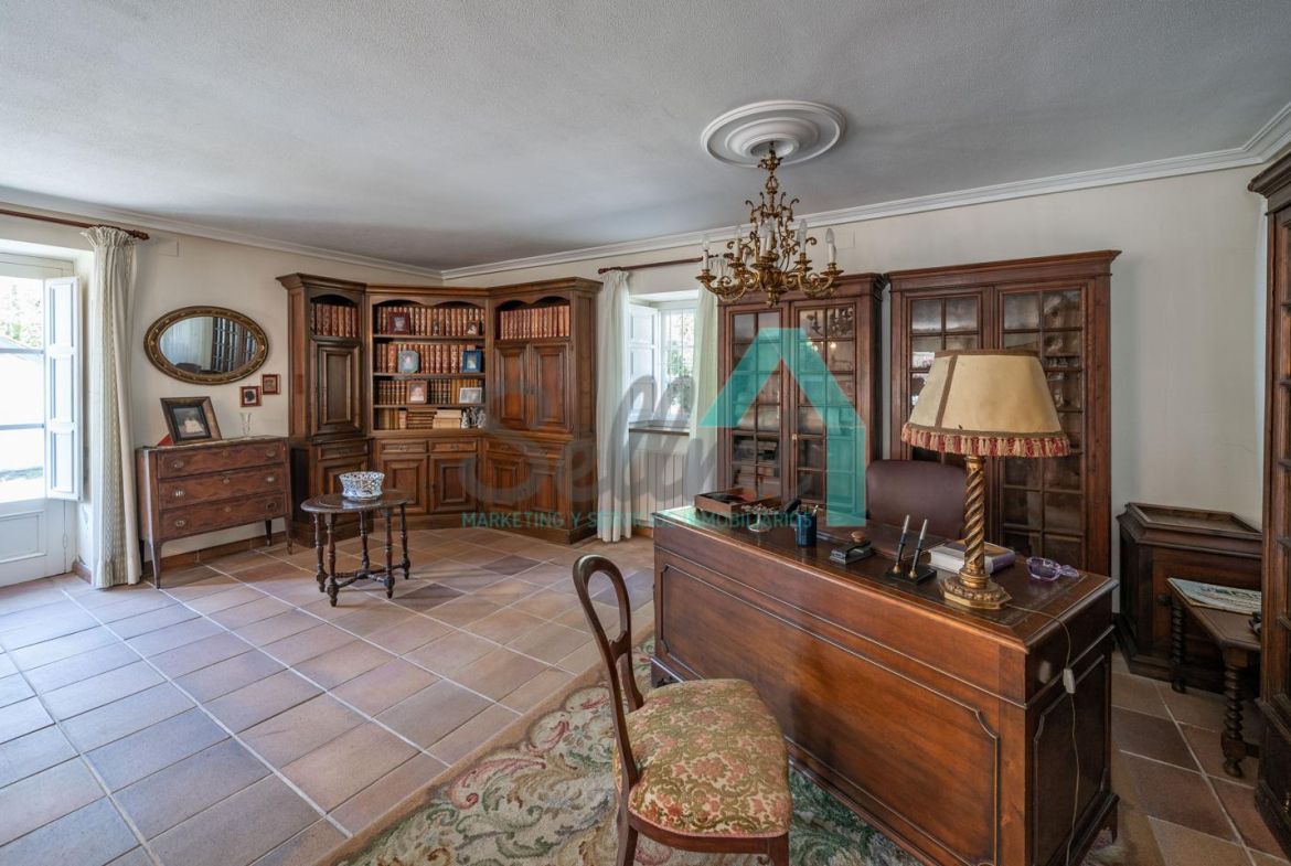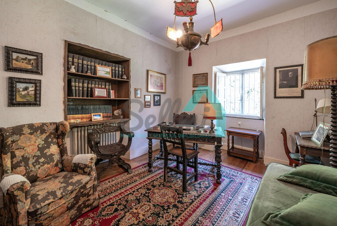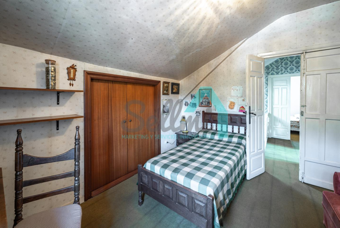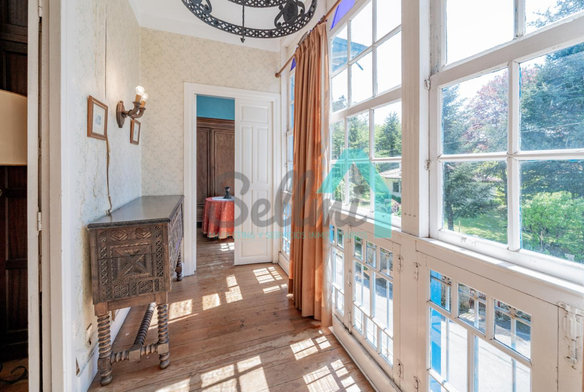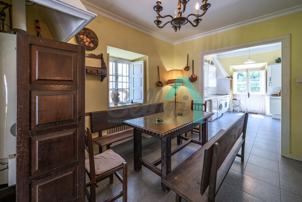 La vivienda está distribuida en tres plantas y cuenta con dos salones (el principal con una gran chimenea), cocina amueblada, una galería con orientación suroeste, nueve habitaciones, cuatro baños y varios trasteros.