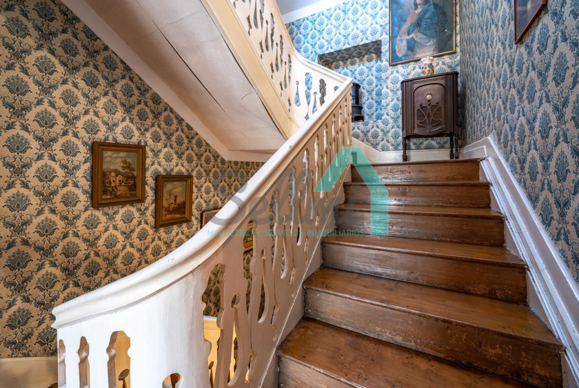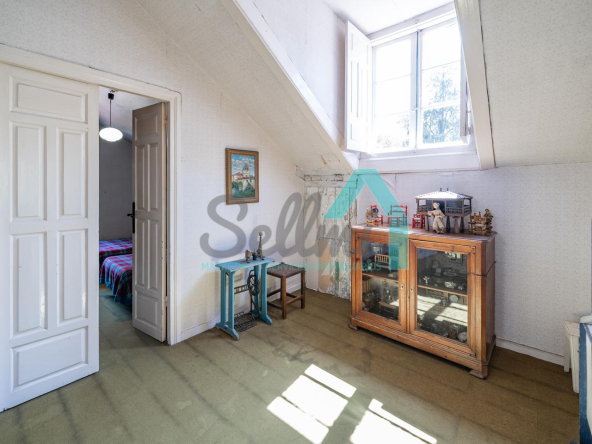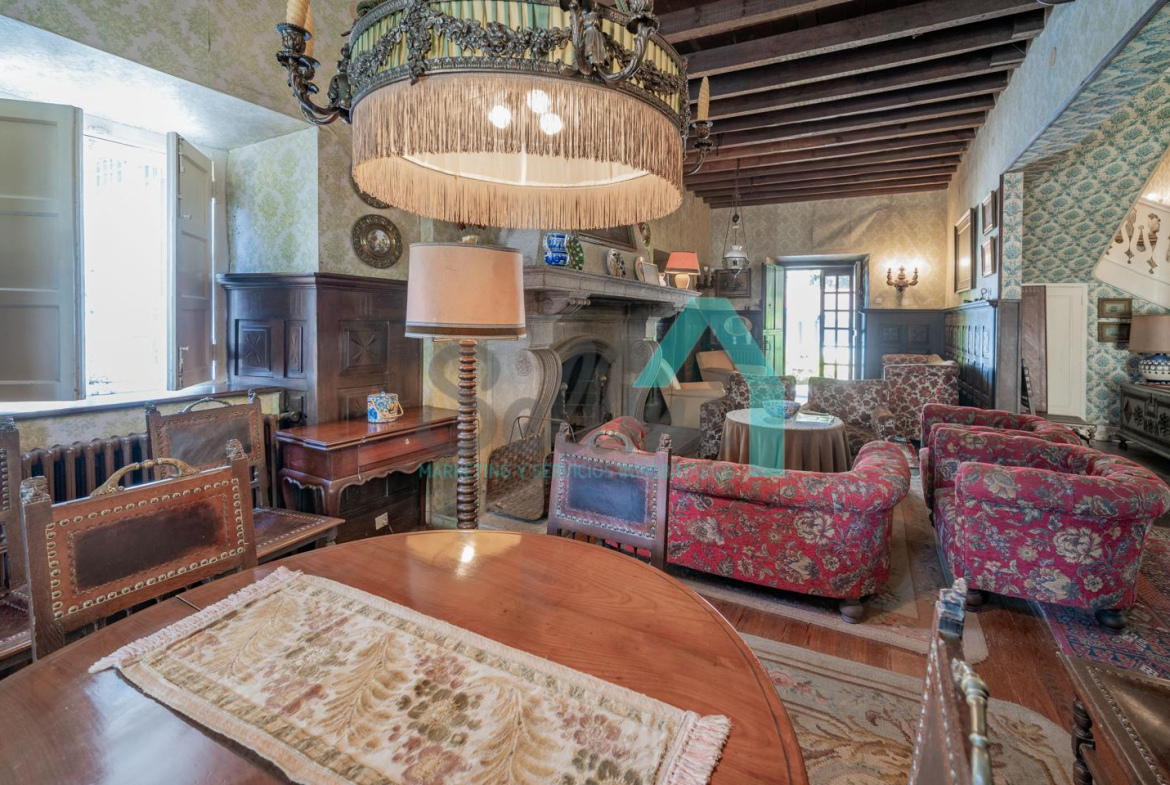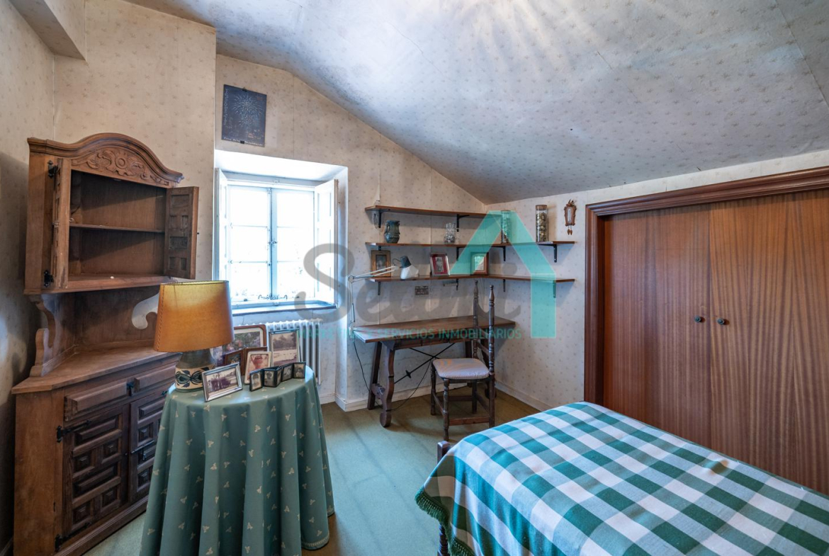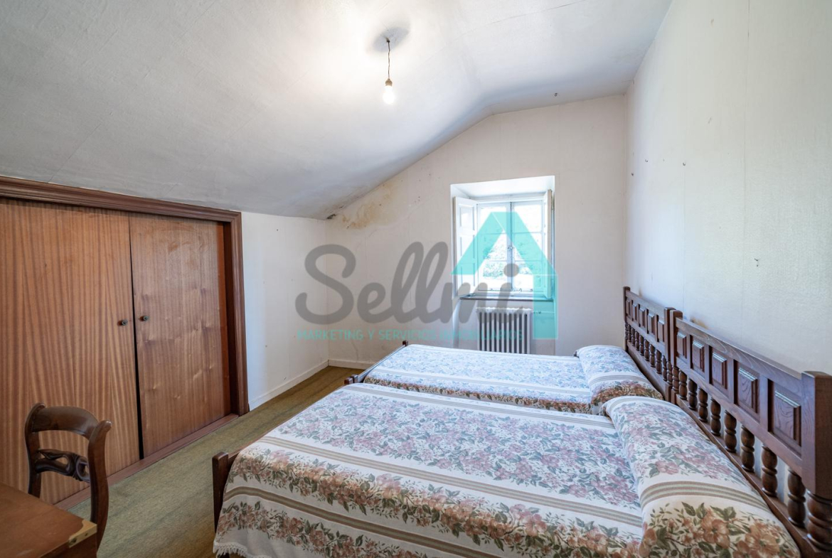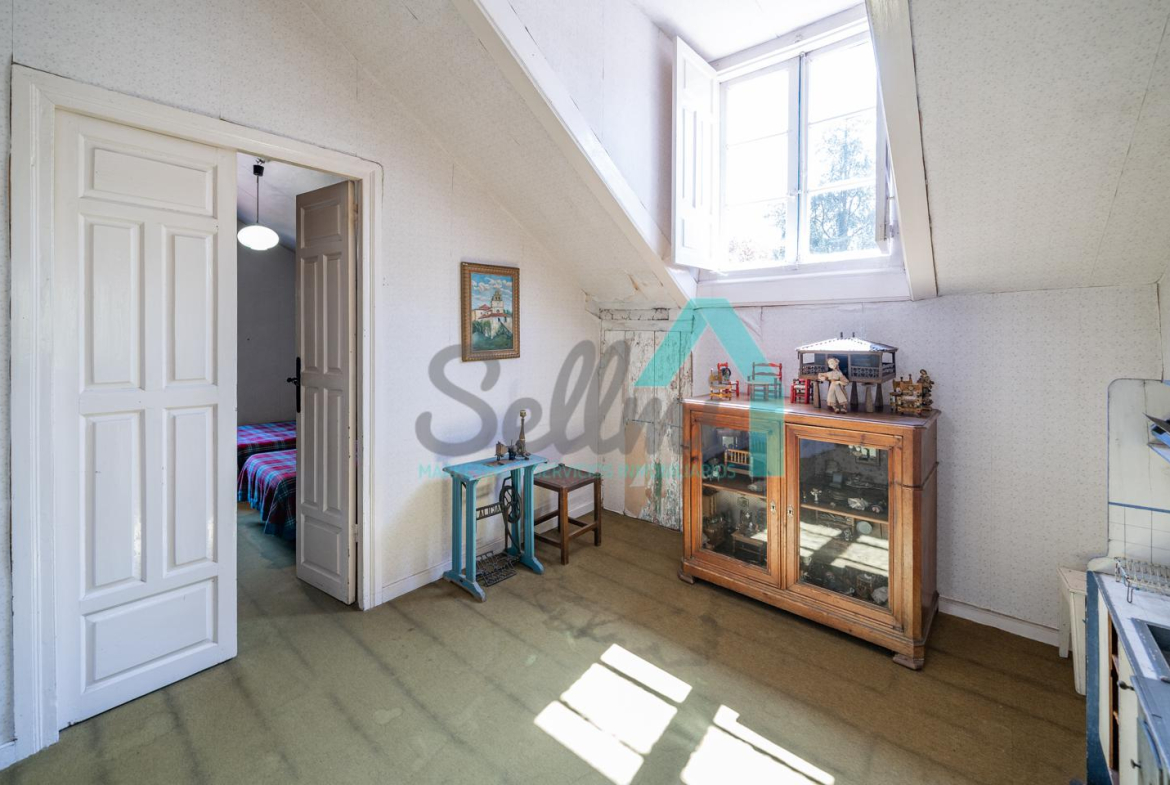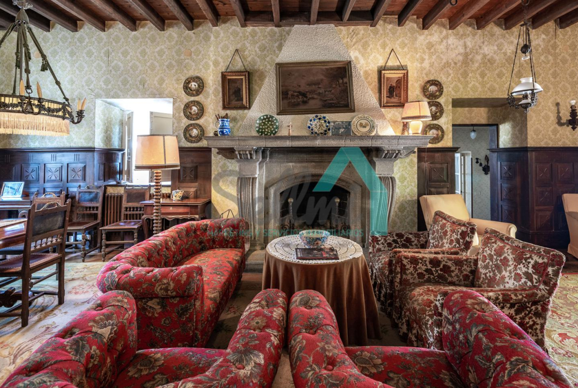 La vivienda está distribuida en tres plantas y cuenta con dos salones (el principal con una gran chimenea), cocina amueblada, una galería con orientación suroeste, nueve habitaciones, cuatro baños y varios trasteros.