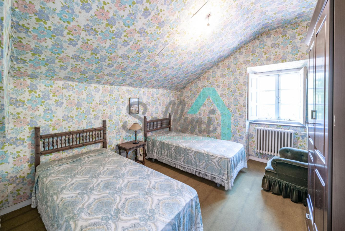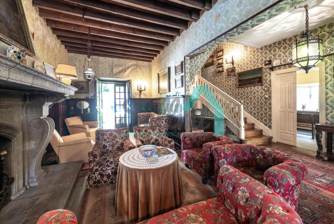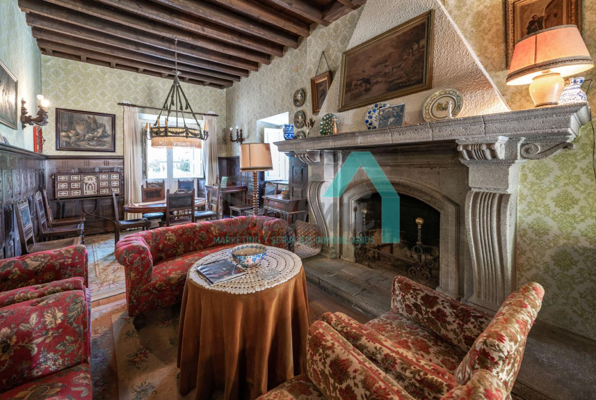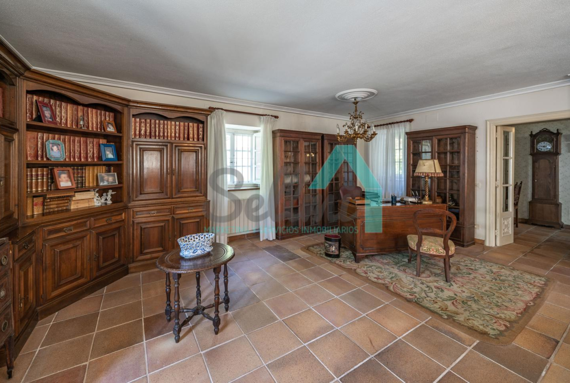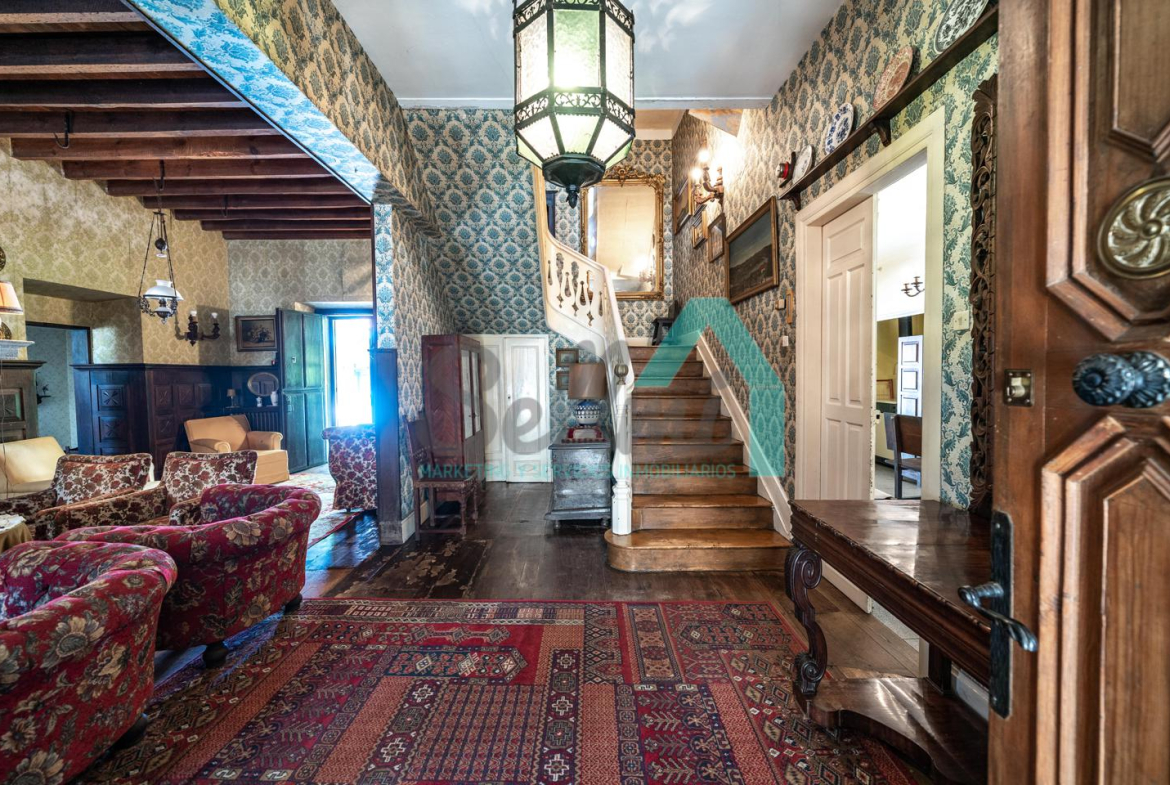 La vivienda está distribuida en tres plantas y cuenta con dos salones (el principal con una gran chimenea), cocina amueblada, una galería con orientación suroeste, nueve habitaciones, cuatro baños y varios trasteros.