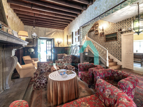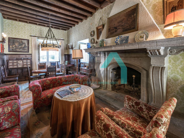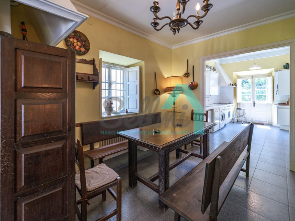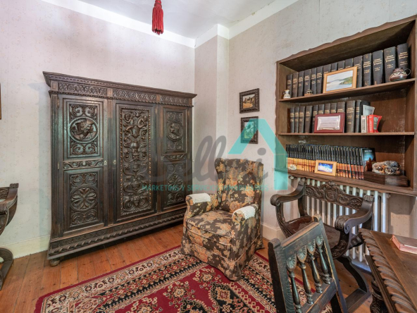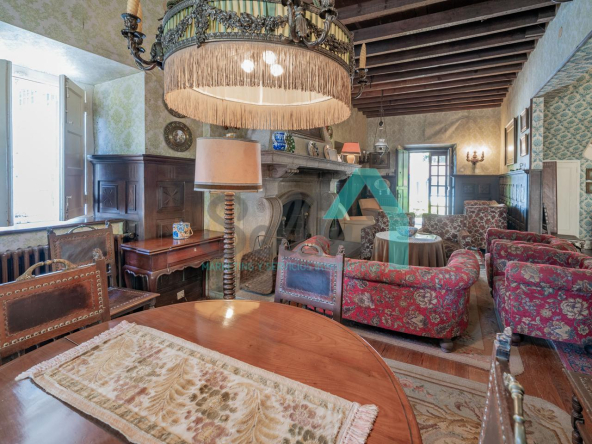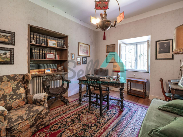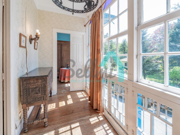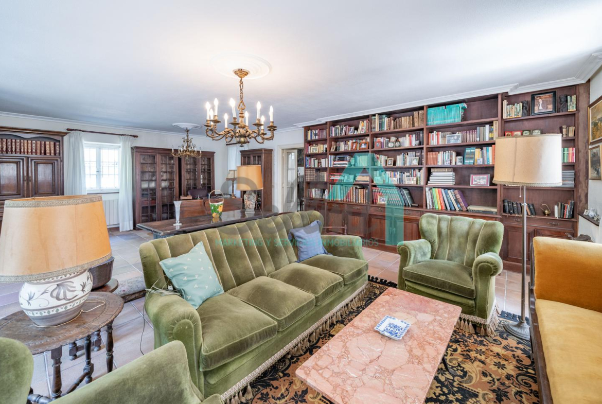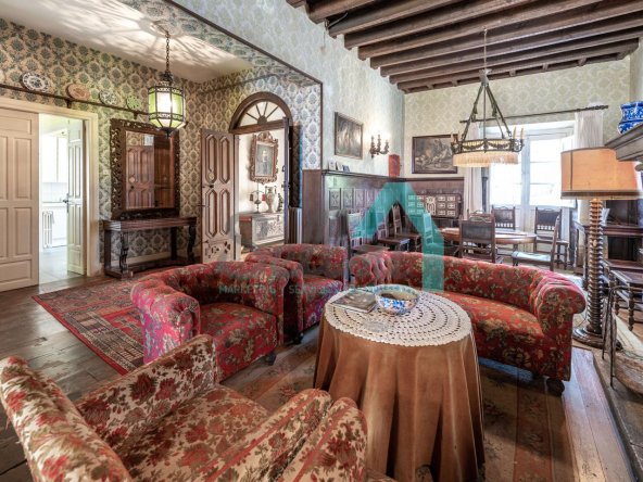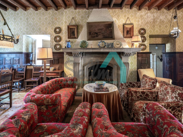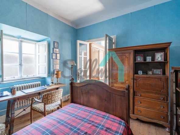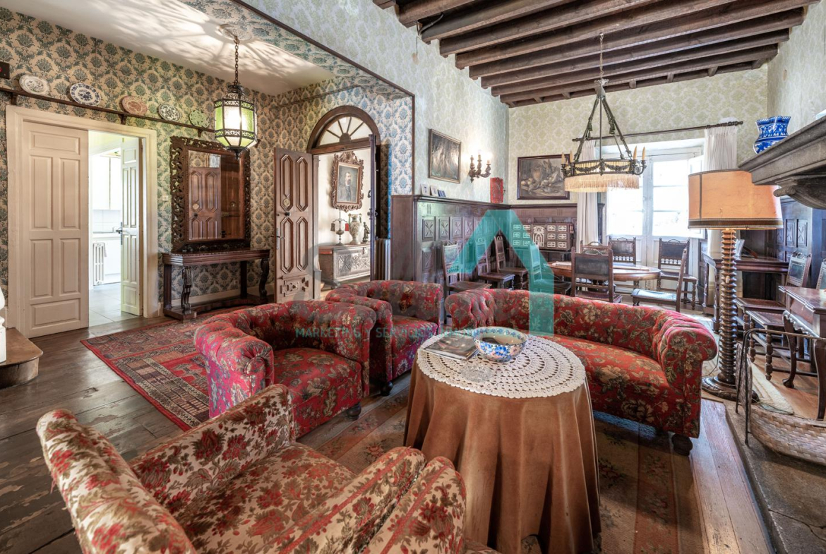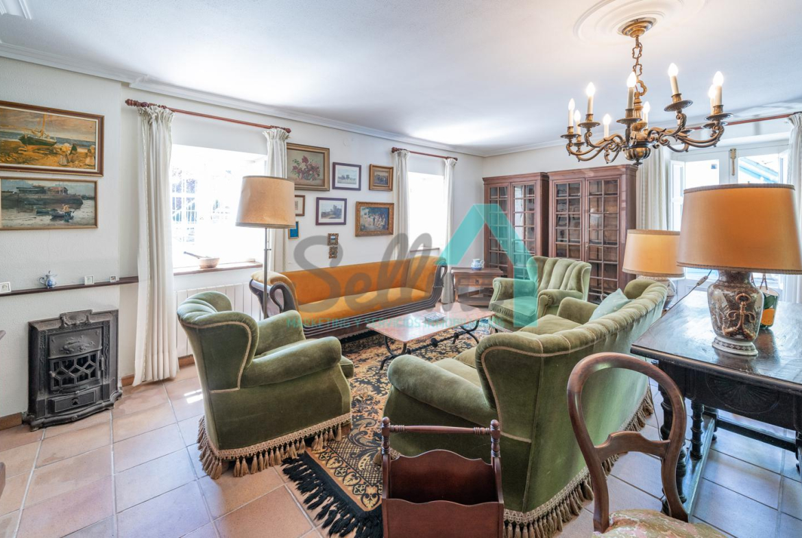 La vivienda está distribuida en tres plantas y cuenta con dos salones (el principal con una gran chimenea), cocina amueblada, una galería con orientación suroeste, nueve habitaciones, cuatro baños y varios trasteros.