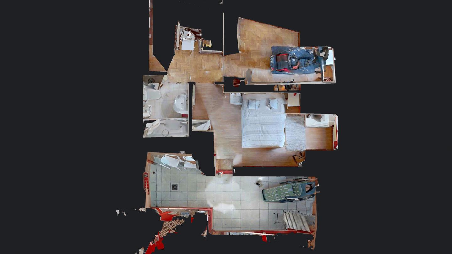 Planta alta: distribuidor, dos habitaciones, un baño completo con bañera y una terraza de buen tamaño (unos 15 m2).