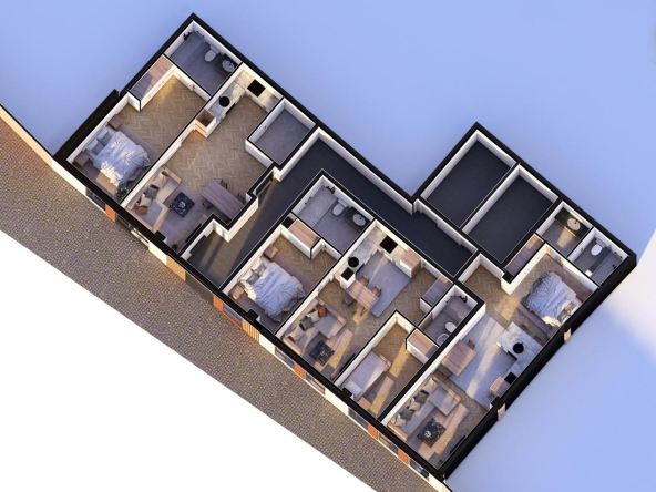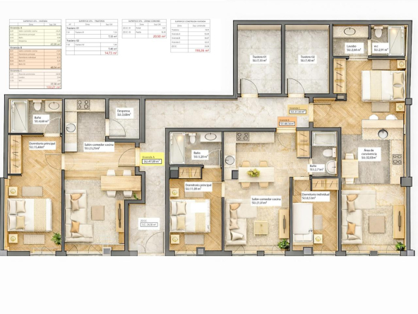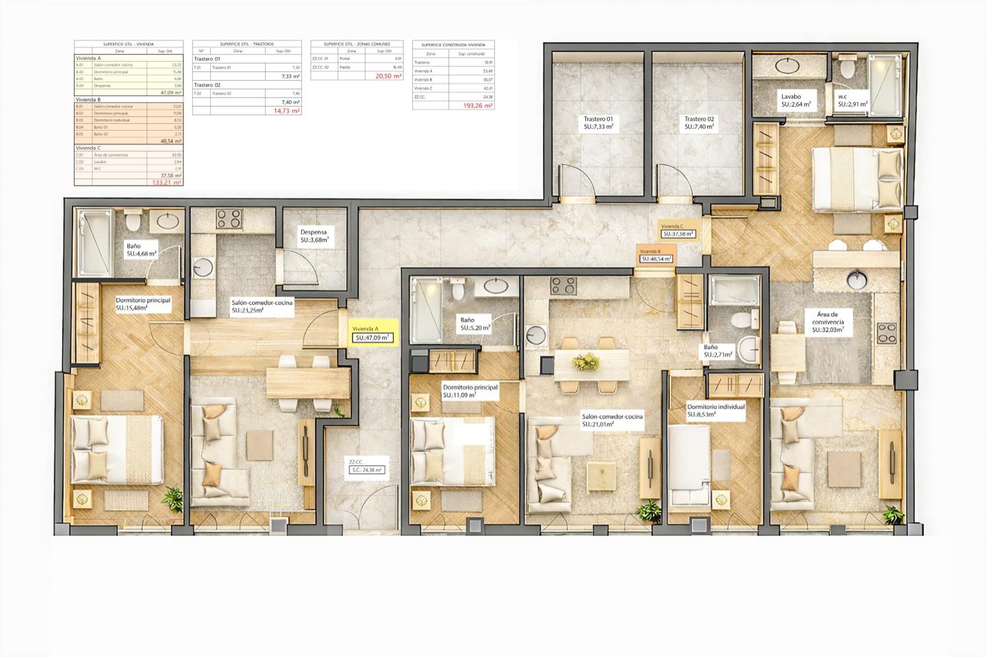 Vivienda B: 48,54 m² – salón comedor con cocina, dos dormitorios y dos baños completos.