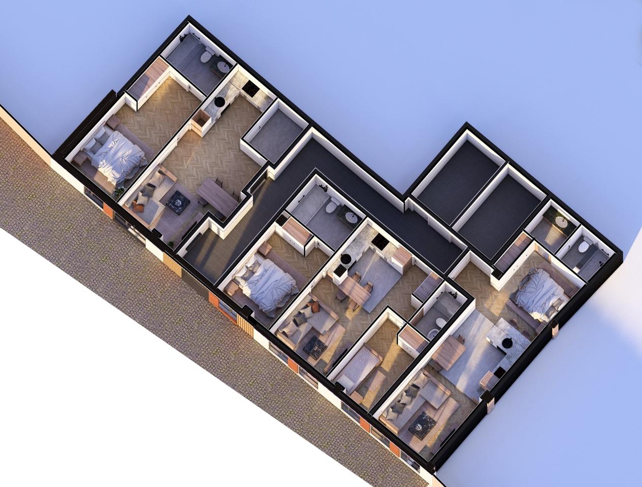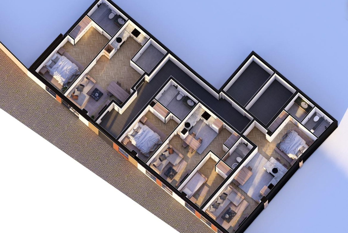 Vivienda C: 37,58 m² – tipo estudio con salón comedor/cocina/dormitorio y un baño completo.