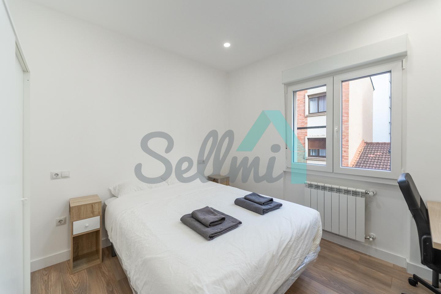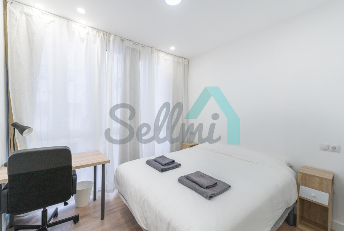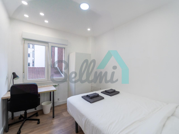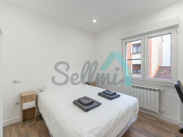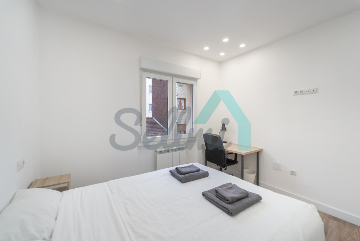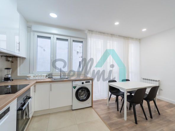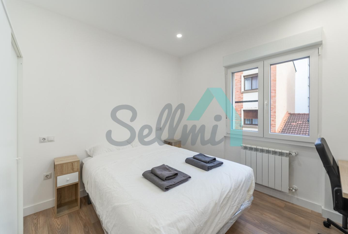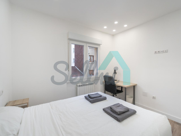Se alquilada totalmente amueblada y equipada y dispone de suelos de tarima y gres, ventanas de doble acristalamiento, calefacción individual de gas ciudad, puerta de seguridad, videoportero, mesas de estudio, etc. Es exterior, con orientación noreste (calle) y suroeste (patio).