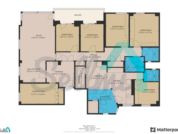 6 habitaciones y 3 baños.