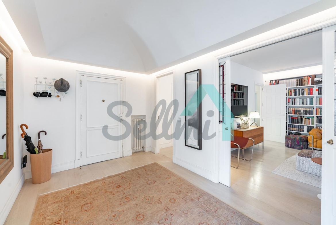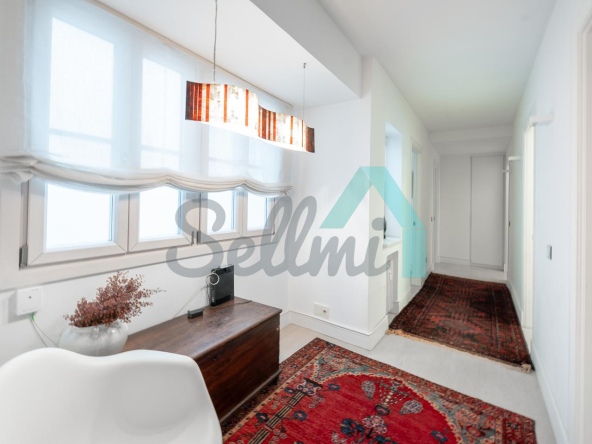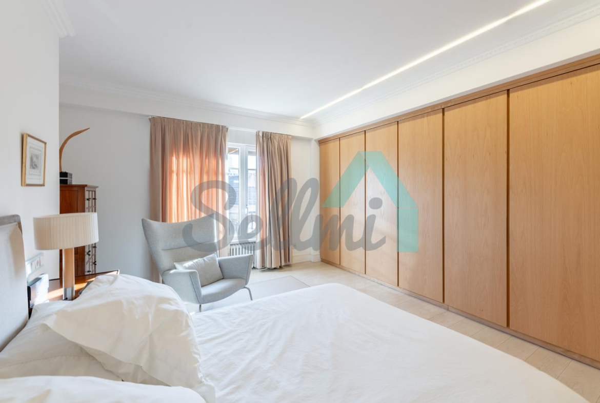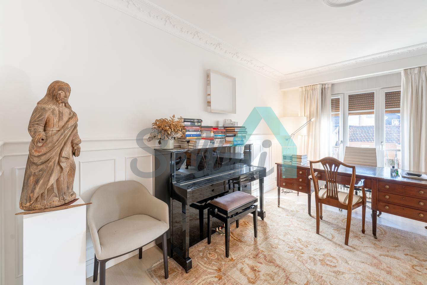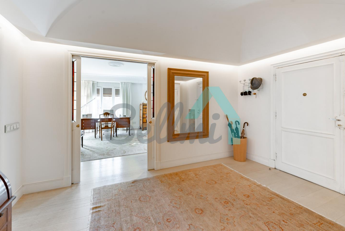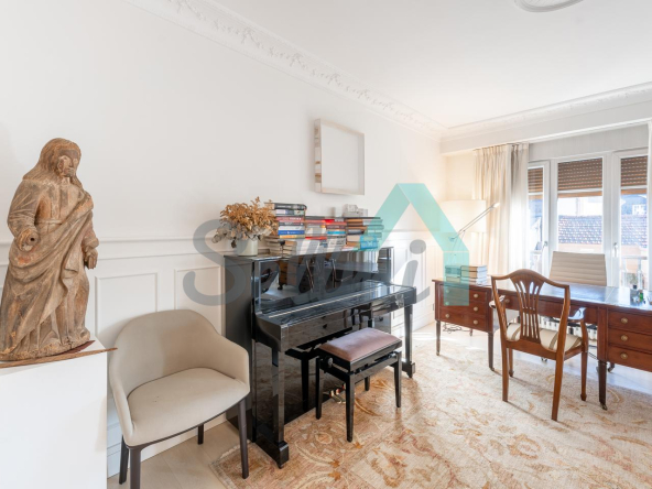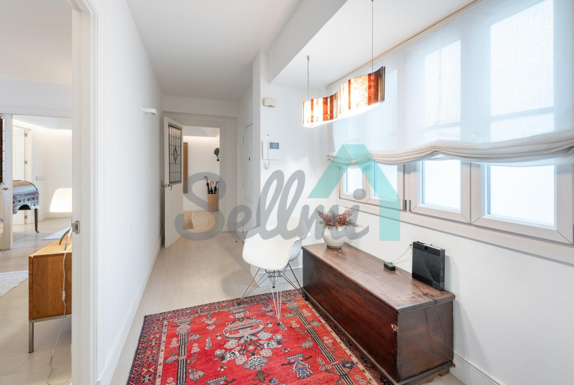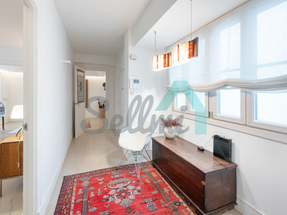Dispone de dos puertas de acceso, suelos de tarima y gres, ventanas de doble acristalamiento, armarios empotrados, calefacción central con contador individual, techos con molduras originales, videoportero, etc.