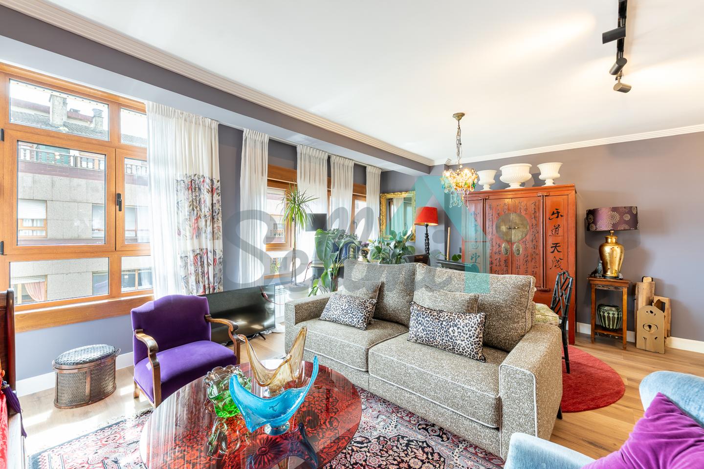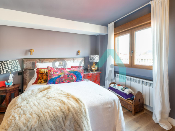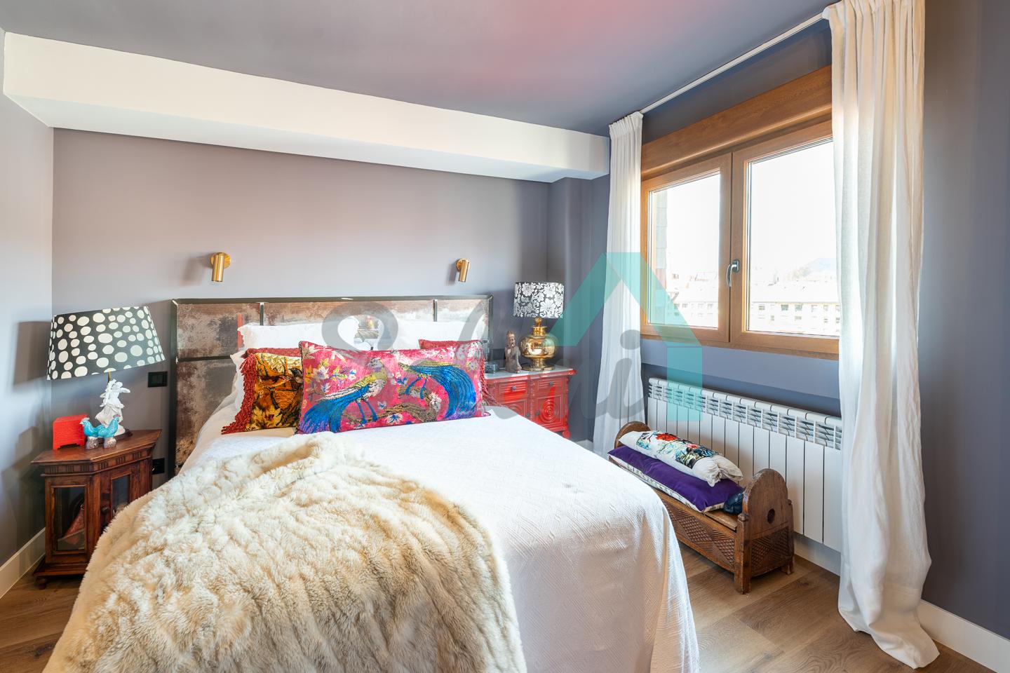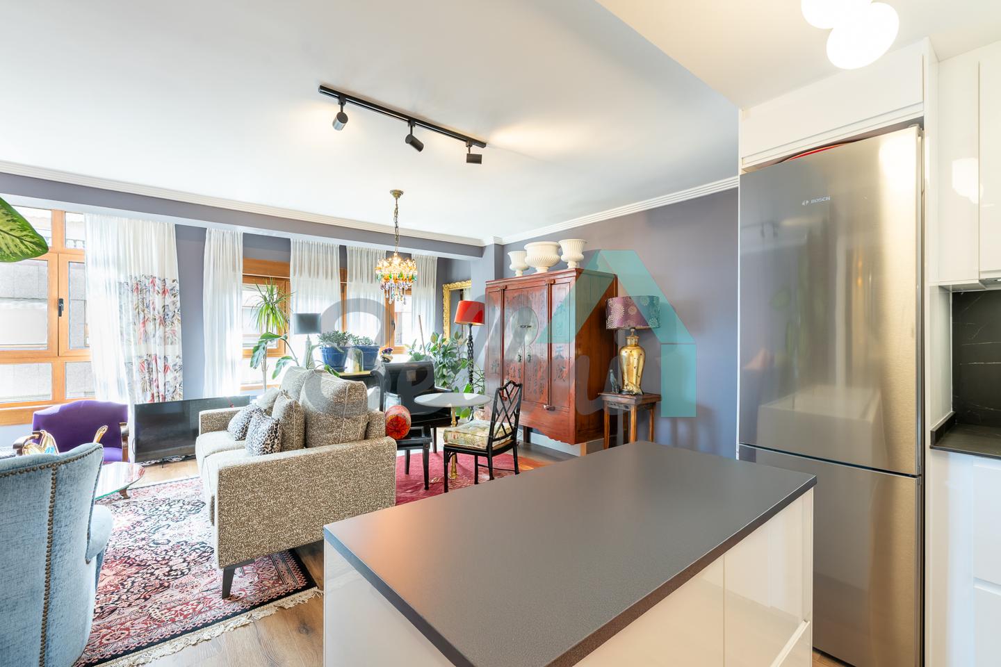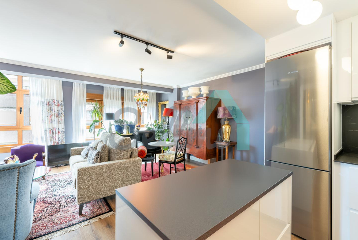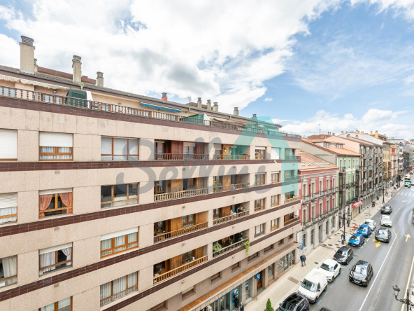Dispone de calefacción individual de gas ciudad, ventanas de doble acristalamiento, suelos de tarima y gres, puerta de seguridad, videoportero, etc. Es exterior, con orientación sureste (calle) y noroeste (patio de manzana con vistas al Fontán).