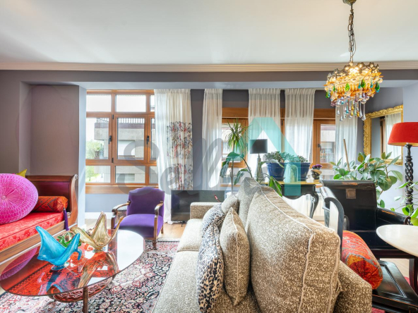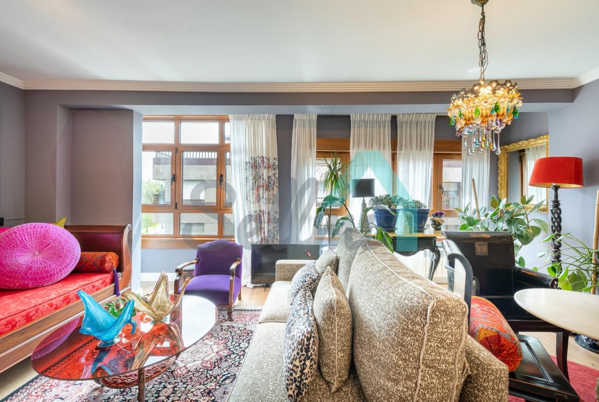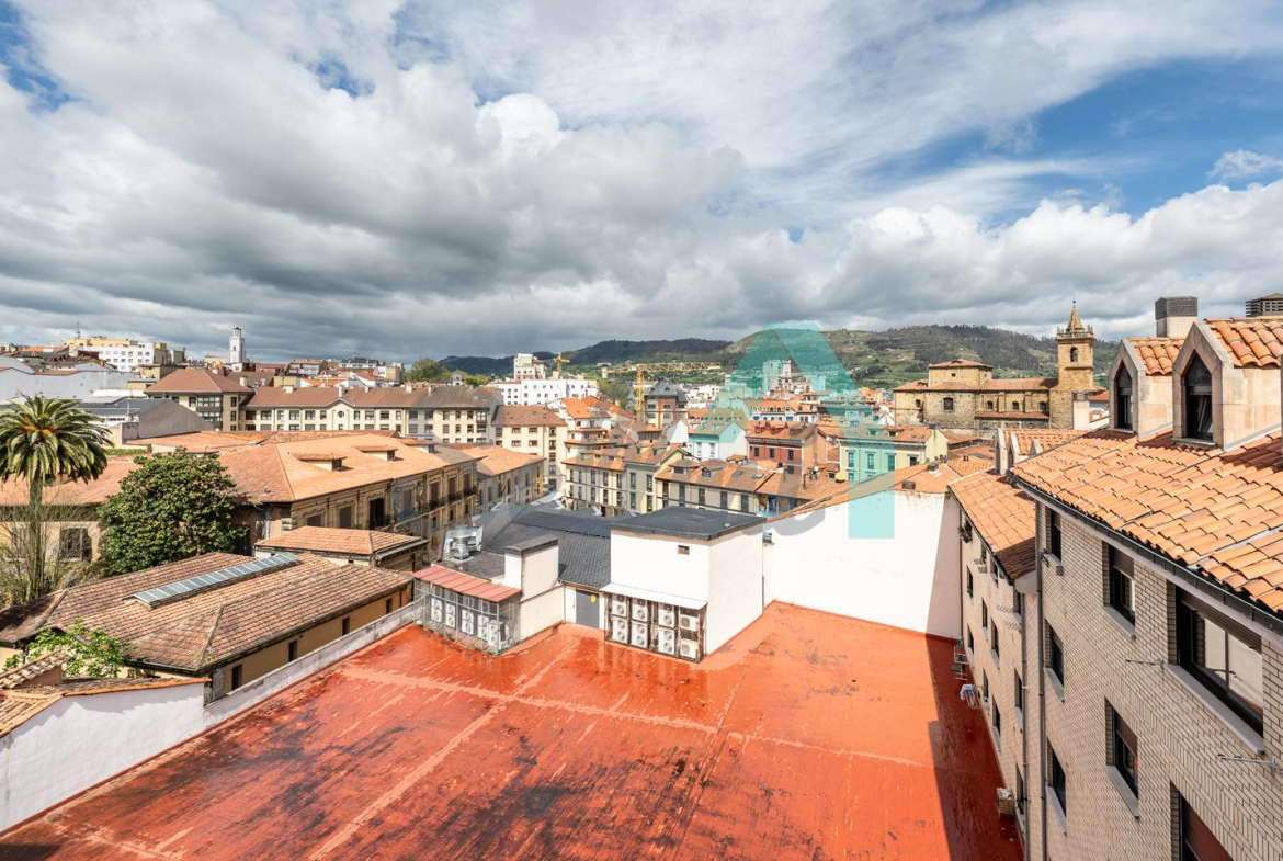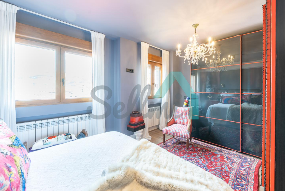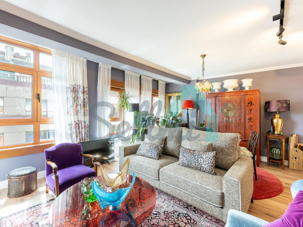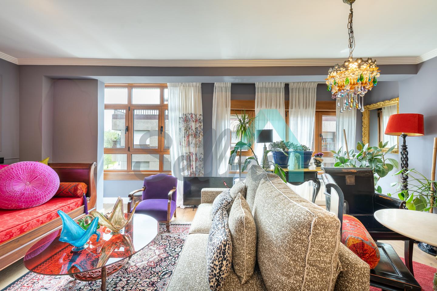 Dispone de calefacción individual de gas ciudad, ventanas de doble acristalamiento, suelos de tarima y gres, puerta de seguridad, videoportero, etc. Es exterior, con orientación sureste (calle) y noroeste (patio de manzana con vistas al Fontán).